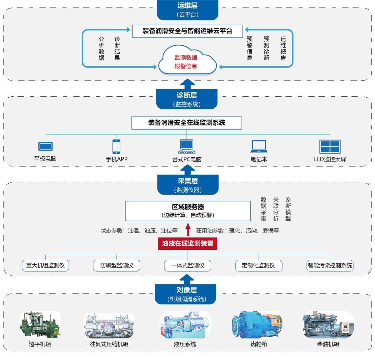 油液在線監(jiān)測系統(tǒng)(OMS)是集“多傳感器集成和軟件平臺開發(fā)”為一體的設(shè)備潤滑安全監(jiān)測綜合性預(yù)警產(chǎn)品(企業(yè)裝備油液在線監(jiān)測與故障預(yù)警系統(tǒng)),能實時監(jiān)測裝備在用油液的劣化、污染及部件的磨損狀態(tài)變化,有效預(yù)防裝備的重大潤滑磨損事故,提高企業(yè)裝備的可靠性,助力企業(yè)裝備智能遠(yuǎn)程運維。該系統(tǒng)主要由硬件系統(tǒng)和軟件系統(tǒng)等組成,硬件系統(tǒng)包括主傳感器(粘度傳感器、水分傳感器、污染顆粒傳感器、鐵磁磨粒傳感器、密度傳感器、油品品質(zhì)傳感器、溫度傳感器)、傳感器接口模塊、數(shù)據(jù)采集卡、電源、工控機、通訊系統(tǒng)等,軟件系統(tǒng)分為工控機版本、局域網(wǎng)版本、互聯(lián)網(wǎng)版本等。