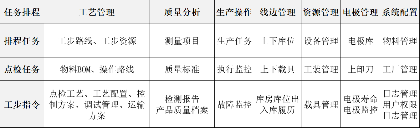 智能柔性生產(chǎn)管理系統(tǒng)是智能產(chǎn)線的大腦,通過(guò)柔性工藝配置對(duì)產(chǎn)品、機(jī)床、測(cè)量設(shè)備、電極、工裝夾具、線邊庫(kù)等進(jìn)行協(xié)同管控。其?向上對(duì)接?MES/ERP?系統(tǒng)進(jìn)行計(jì)劃的同步,向下對(duì)接設(shè)備層實(shí)現(xiàn)程序下發(fā)、設(shè)備控制、數(shù)采監(jiān)控,對(duì)刀換刀等功能。